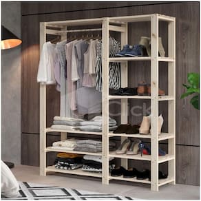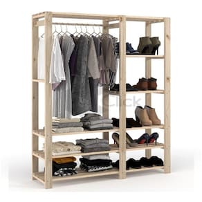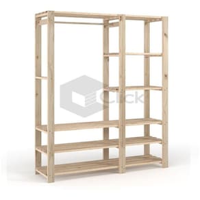 Estante arara com prateleiras e estrutura em madeira maciça de Pinus.