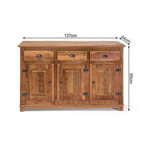 Arca rústica em madeira maciça, com acabamento natural que valoriza os veios da madeira. Com três portas e três gavetas, oferece charme, funcionalidade e muito espaço para organizar e decorar com estilo.