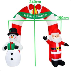 Esse arco inflável possui uma altura de 240 cm e uma largura de 190 cm, sendo ideal para ser colocado na entrada da sua casa. Com cores vibrantes como vermelho, verde e branco, ele traz a atmosfera natalina para o seu lar. Além disso, conta com um enfeite de Papai Noel e boneco de neve, que deixam a decoração ainda mais encantadora.