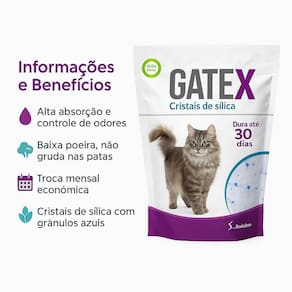 Por que escolher a gatex Cristais grossos: granulação maior que proporciona conforto ao gato e menos rastros pela casa. Alta absorção: encapsula a umidade rapidamente, deixando a superfície seca. Controle eficiente de odores: ajuda a neutralizar cheiros por muito mais tempo. Baixa poeira: manuseio mais limpo e higiênico. Rende mais: uso econômico, com troca completa aproximada de até 30 dias Para um gato. Limpeza simples: remova apenas os sólidos diariamente e misture os cristais para renovar o leito. Aparência limpa: cristais com grânulos azuis que ajudam a identificar pontos de umidade. Marca: Não Informado