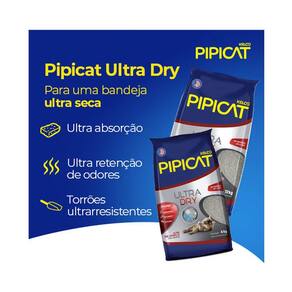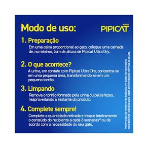 Coloque uma camada de 5cm de altura de Pipicat Ultra Light no recipiente de uso do gato. A urina, em contato com o Pipicat Ultra Dry, concentra-se em uma pequena área, transformando-se em um pequeno torrão. Remova o torrão formado pela urina ou fezes, reaproveitando o restante do produto. Complete a quantidade retirada e troque inteiramente o conteúdo do recipiente a cada 6 semanas. Não descartar no vaso sanitário.