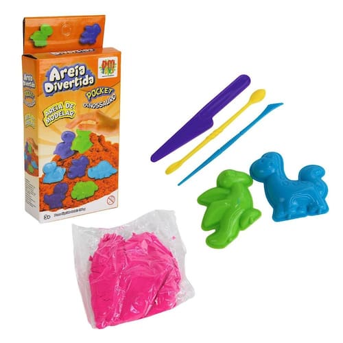 Areia Mágica 150g com 2 Moldes Dinossauro So Brinquedo sensorial Fidget Toys Areia Divertida Edição de Bolso Dinossauros, conhecida como areia satisfatória, permite criar moldes, aliviar o desconforto e entreter a criançada. Contém: 2 Moldes de Plástico, 3 Ferramentas de Plástico, 1 Saco com Areia de Modelar de 150gr.\nMarca : DM Tipo de material : Areia de quartzo, Plástico Cores ou Estampa : diversos Dimensões do Produto : 19,5 X 9 X 3,5 CM Peso Bruto (Gramas) : 0.194 Marca: Não Informado
