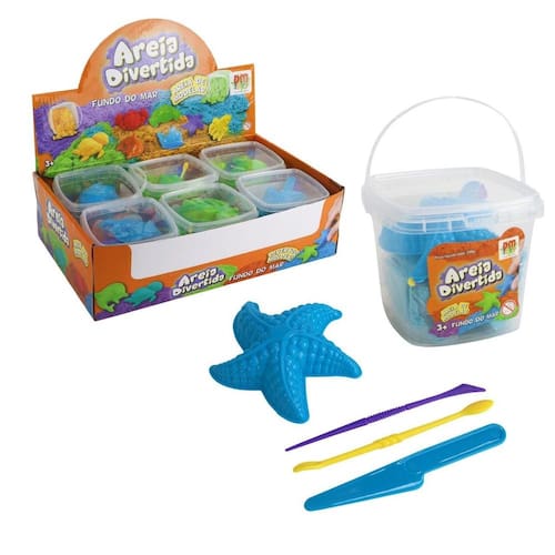 Areia Mágica 250g com Molde Balde Fundo do M Brinquedo sensorial Fidget Toys Areia Divertida Fundo do Mar, conhecida como areia satisfatória, permite criar moldes, aliviar o desconforto e entreter a criançada, acompanha um baldinho para guardar e levar para os lugares. Contém: 1 Molde de Plástico, 3 Ferramentas de Plástico, 1 Saco com Areia de Modelar de 250gr, 1 Balde.\nMarca : DM Tipo de material : Areia de quartzo, Plástico Cores ou Estampa : diversos Dimensões do Produto : 8,5 X 9,5 X 9,5 CM Peso Bruto (Gramas) : 0.292 Marca: Não Informado