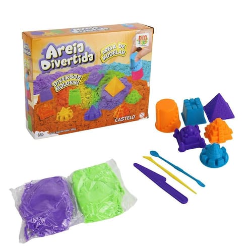 Areia Mágica 300g com 6 Moldes Castelo Brinquedo sensorial Fidget Toys Areia Divertida Castelo, conhecida como areia satisfatória, permite criar moldes, aliviar o desconforto e entreter a criançada. Contém: 6 Moldes de Plástico, 3 Ferramentas de Plástico, 2 Sacos com Areia de Modelar de 150gr cada (300gr no total).\nMarca : DM Tipo de material : Areia de quartzo, Plástico Cores ou Estampa : Colorido Dimensões do Produto : 15 X 19 X 4 CM Peso Bruto (Gramas) : 0.432 Marca: Não Informado