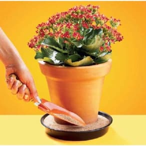 Coloque uma pequena porção de areia nos pratos para vasos e coloque o vaso de planta por cima da areia. Após colocar o vaso complete o prato da planta com areia até atingir a borda. Observe o teor de umidade da areia para realizar a rega de suas plantas.