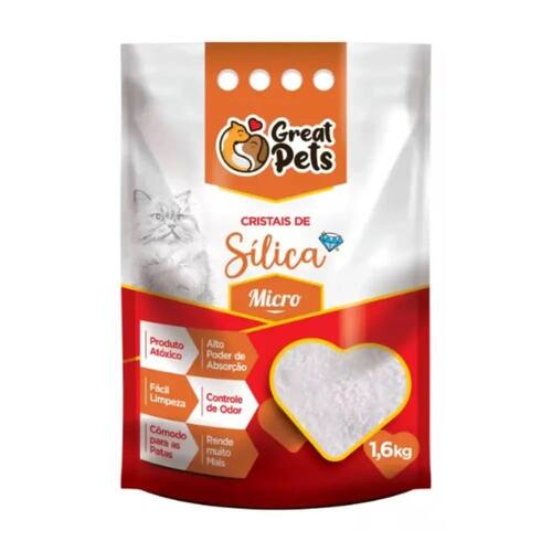 Areia Gato Higiênica Sílica Fina Great Pets 1,6kg Explore os Cristais de Sílica Fina da Great Pets, a escolha premium para a higiene do seu gato. Compostos por Dióxido de Silício, esses cristais são vendidos em pacotes de 1,6kg com índice mínimo de umidade, proporcionando maior rendimento. Indicados para todas as raças e tamanhos de gatos, esses cristais não aglomerantes são atóxicos e oferecem altíssimo poder de absorção. Os Cristais de Sílica Fina proporcionam controle extraordinário de odor e conforto para as patas. Além disso, duram até cerca de 30 dias por gato, garantindo limpeza com zero retenção no fundo e nas laterais. A embalagem elegante inclui um prático pegador e sistema abre fácil, facilitando o uso diário. Benefícios: - Um saco de 1,6kg dura cerca de 1 mês - Rápida absorção de urina e fezes. Reduz a emissão de bactérias - Reduz o mau cheiro da urina e fezes, os cristais de sílica atuam como filtros - Cômodo para as patas Conteúdo: - 1 Pacote de cristais de silica fina