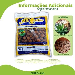 Características * Produto: Argila Expandida * Marca: All Garden * Peso Líquido: 5 kg * Composição: Argila natural expandida * Aspecto: Grânulos arredondados e leve. * Cor: Marrom * Leveza: Material de baixa densidade, não adiciona peso excessivo a vasos e estruturas. * Alta Porosidade: Permite excelente circulação de ar e retenção de água. * Sustentabilidade: Produto natural e ecológico.