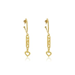 Esse brinco é composto por uma argolinha articulada, seguido da palavra PAZ escrita na vertical em uma chapa e finalizando com um pequeno coração vazado.