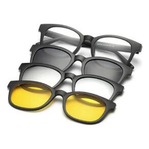 Contém: 1 armação para óculos+ 3 lentes clip on (2 Solares e 1 Noturna) Material da armação: Plástico (Resistente) Material das lentes: Resina Atributo das lentes: Prateada: Polarizada e com proteção UV400 Amarelo e preta: Proteção UV400