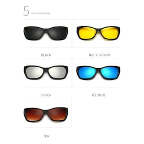 Item: 1 Óculos de lente transparente (Pode colocar grau) + 5 Lentes Clip On (Lente amarela, azul, marrom, espelhada e preta) para serem utilizadas por cima do óculos.