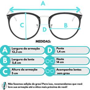 Largura total da armação: 13,3 cm Largura da lente: 5,6 cm Altura da armação: 5 cm Ponte: 1,4 cm Comprimento da haste: 14 cm