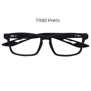 É feita em TR90, em formato retangular, na cor preta, muito leve, confortável e resistente.