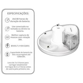 Especificações Técnicas: Marca: NSBAO Modelo: YG-B1 Material: Plástico de alta resistência Acompanha algumas iscas para a mosca Utiliza uma bateria de lithium recarregável de 1200mAH Tensão da carga: 5V usando cabo USB Luz indicador de carga: Carregue a bateria de 2 a 3 horas na 1. Vez que for usar. Leia as instruções na caixa antes de usar. Peso: 550g Cor: Branco