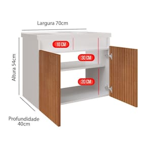 O Armarinho de Banheiro 2 Portas Sem Pia Perseu possui medidas montadas de 54cm de altura, 70cm de largura e 40cm de profundidade.