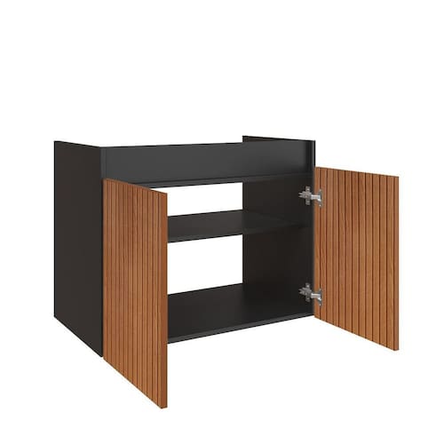 O armarinho Perseu está disponível na cor preto/ripado, garantindo um visual moderno e elegante para o seu banheiro.