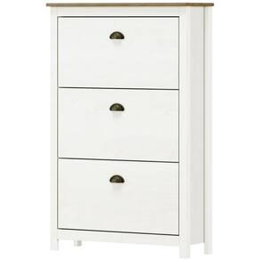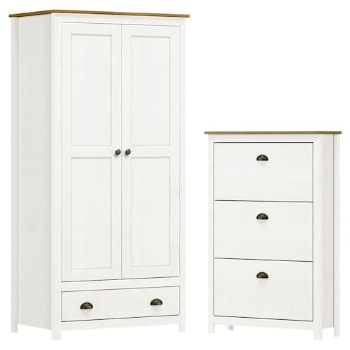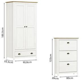 Conjunto Armário e Sapateira projetado para quem busca móveis sofisticados e atemporais. Produzido em madeira maciça de pinus de reflorestamento, sua estrutura robusta garante durabilidade e resistência. Seu acabamento com pintura acetinada em verniz PU e UV realça a beleza natural da madeira enquanto protege contra desgastes do dia a dia. O Armário possui 02 portas com dobradiças com amortecimento, e 01 gaveta com corrediças telescópicas, permitindo uma abertura suave e silenciosa. Além de 01 cabideiro em alumínio, e 03 prateleiras sendo 02 removíveis, podendo ajustar o espaço interno conforme a necessidade. A Sapateira conta com 03 gavetas com compartimentos específicos para calçados e amplo espaço para armazenamento, comportando até 18 pares. O design funcional apresenta também puxadores metálicos no estilo concha que agregam um charme artesanal, enquanto os pés alongados em madeira trazem leveza e sofisticação ao móvel. Estes móveis chegarão em sua casa separados em 03 volumes.