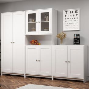Um conjunto de armário cheio de personalidade. Composto pelo AC4004, AC4005 e BM08, com oito portas com detalhe emoldurado, sendo duas com detalhes em vidro, e puxadores ponto. Amplo espaço interno e que deixará seu espaço lindo e organizado.
