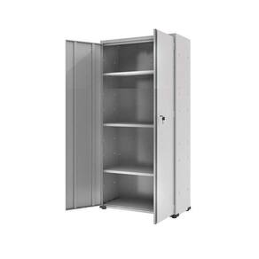 Ele é composto por 03 prateleiras reforçadas, sendo uma fixa e três reguláveis. Super resistente, suporta até 30Kg bem distribuídos por prateleira. Possui pés niveladores para melhor adaptação e um perfeito acabamento, evitando assim riscos no piso. Sua porta, com fechadura tipo Yale e puxador estampado em perfil PVC possui também reforço ômega e um prefeito acabamento que proporciona maior praticidade de uso.