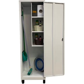 Armário de Aço para Lavanderia Multiuso com Chave – Cor Cinza Organize sua lavanderia, área de serviço ou espaço de limpeza de forma prática e funcional. Este armário conta com nichos internos, suporte para vassouras e espaço para baldes, otimizando o ambiente e mantendo tudo no lugar. Produzido em aço de alta resistência e com pintura eletrostática, é ideal para ambientes que demandam durabilidade e resistência à umidade. Possui pés que evitam contato direto com o piso, facilitando a limpeza e auxiliando na proteção da estrutura. Possui sistema de fechamento com chave, proporcionando mais segurança para os itens armazenados.