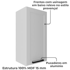 O Armário Aéreo ideal para seu dia a dia. Produzido 100% em MDF de 15mm (fundo de 3mm) com acabamento em pintura UV (brilho) que garante durabilidade. Móvel suspenso com 1 porta equipada com dobradiças reta caneco de 35mm e amortecedor slow motion, com detalhes em usinagem de baixo relevo no estilo provençal, bordas em PVC que oferecem maior proteção e puxadores em alumínio. Perfeito para quem busca organização, funcionalidade e elegância para sua cozinha!Este móvel chegará na sua casa separado em 01 volume.