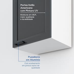 Com amplo espaço interno e gavetas de deslizamento suave graças às corrediças telescópicas, ele é ideal para organizar sua cozinha de forma eficiente. As portas robustas possuem dobradiças reforçadas de 35mm e o armário aéreo com pistão a gás é perfeito para instalação sobre geladeiras ou fogões. Os puxadores em alumínio com pintura epóxi oferecem um toque de design contemporâneo e resistência ao uso diário. Os pés em PVC de 14,5 cm são ajustáveis para maior estabilidade, e os rodapés removíveis facilitam a limpeza do dia a dia.