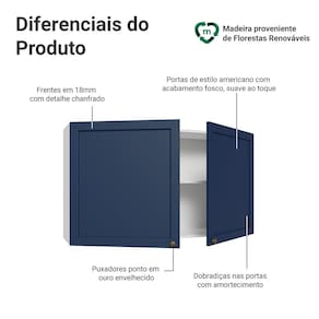 O acabamento de alta resistência da estrutura é em Branco e das frentes em Azul. Possui uma textura suave ao toque, trazendo leveza e sofisticação ao ambiente. O destaque vai para os puxadores ponto em ouro envelhecido, feitos com metal resistente, que adicionam personalidade e um charme único. Outro diferencial está no detalhe chanfrado das frentes, que forma molduras elegantes e dá profundidade ao design, refletindo o estilo americano com um toque moderno.