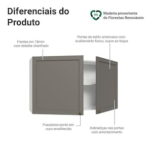 O acabamento de alta resistência da estrutura é em Branco e das frentes em Cinza. Possui uma textura suave ao toque, trazendo leveza e sofisticação ao ambiente. O destaque vai para os puxadores ponto em ouro envelhecido, feitos com metal resistente, que adicionam personalidade e um charme único. Outro diferencial está no detalhe chanfrado das frentes, que forma molduras elegantes e dá profundidade ao design, refletindo o estilo americano com um toque moderno.