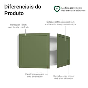 O acabamento de alta resistência da estrutura é em Branco e das frentes em Verde. Possui uma textura suave ao toque, trazendo leveza e sofisticação ao ambiente. O destaque vai para os puxadores ponto em ouro envelhecido, feitos com metal resistente, que adicionam personalidade e um charme único. Outro diferencial está no detalhe chanfrado das frentes, que forma molduras elegantes e dá profundidade ao design, refletindo o estilo americano com um toque moderno.