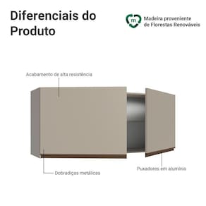 o aéreo traz puxadores em alumínio na cor bronze metalizado, que valorizam o móvel. A abertura é suave e eficiente graças às dobradiças metálicas, que garantem durabilidade no uso diário.