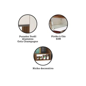 Características: Estrutura: 100 MDP Acabamento: FF -Finish Foil- Quantidade de Portas: 2, 1 de Bater e 1 Basculante Tipo de Dobradiças: Metálica 26mm Tipo de Puxador: Perfil Alumínio Gola Sistema de Montagem: Cavilhas, Parafusos e Minifix Itens Inclusos: 1 Armário Aéreo, kit ferragens e manual de montagem Garantia: 3 meses