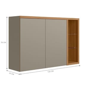 Um aéreo de 1,20m produzido inteiramente em MDF, apresentando uma porta basculante, um nicho decorativo com prateleira de vidro incluindo spot para iluminação, unindo funcionalidade e um visual moderno para sua cozinha