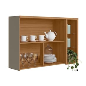 Um aéreo de 1,20m produzido inteiramente em MDF, apresentando uma porta basculante, um nicho decorativo com prateleira de vidro incluindo spot para iluminação, unindo funcionalidade e um visual moderno para sua cozinha