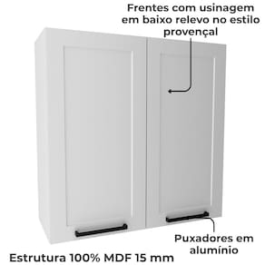 O Armário Aéreo ideal para seu dia a dia. Produzido 100% em MDF de 15mm (fundo de 3mm) com acabamento em pintura UV (brilho) que garante durabilidade. Móvel suspenso com 2 portas equipadas com dobradiças reta caneco de 35mm e amortecedor slow motion, com detalhes em usinagem de baixo relevo no estilo provençal, bordas em PVC que oferecem maior proteção e puxadores em alumínio. Perfeito para quem busca organização, funcionalidade e elegância para sua cozinha!Este móvel chegará na sua casa separado em 01 volume.