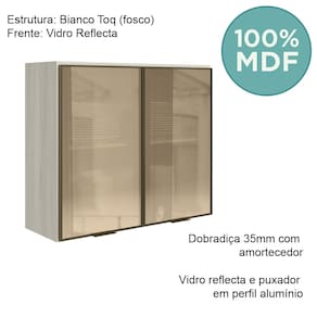 Armário Aéreo para cozinha desenvolvido para composições modernas e funcionais. Fabricado 100% em MDF, com estrutura de 15 mm e forro de fundo de 3 mm. Além disso conta com 2 portas de vidro reflecta com dobradiças de 35mm com amortecedor, que garantem fechamento suave e silencioso, e 1 prateleira interna. Os puxadores em perfil de alumínio completam o produto com um visual funcional e moderno, enquanto o vidro reflecta traz um toque sofisticado e reflexivo. Este móvel chegará em sua casa separado em 02 volumes.