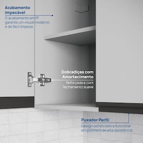 Além disso a linha Nara conta com módulos em reflecta que elevam o visual da cozinha e trazem um ponto de destaque para a decoração. A linha modular Nara possui um sistema modular pensado para funcionar com as principais dimensões de pias e cubas do mercado permitindo versatilidade e encaixe otimizado para sua cozinha desde de o menores espaços até cozinhas amplas. Acabamento da Prateleira: Finish Foil Escala de Brilho da Prateleira: Fosco Acabamento da Porta: Finish Foil Escala de Brilho da Porta: Fosco Material do Puxador da Porta: Plástico Acompanha Tampo: Não Ambiente Principal: Cozinha codigo_ean: 7900288264411 Complexidade da Montagem: Baixa: pode ser montado por uma pessoa sozinha Cor: Cinza Claro Cor do Produto: Cinza Claro Escala de Brilho: Fosco Itens Inclusos: 1 Armário, Manual de Montagem e Kit Ferragens Manual de Montagem e Instalação: https://product-hub-prd.madeiramadeira.com.br/491628370/documents/f38fe747-6aee-48e9-8f54-610c7790334732646946005175985772594.pdf Marca: CabeCasa MadeiraMadeira Material da Dobradiça/Corrediça da Porta: Metálica Material da Porta: MDP Material da Prateleira: MDP modular: Sim Necessita Montagem: Sim Origem do Produto: Nacional Peso: 23,55 kg Peso Máximo por Prateleira: 4 kg Possui Espelho: Não Possui Possui Pés: Não Possui Portas: Sim Possui Prateleiras: Sim Produto Montado: Sim Recomendações de Uso, Manutenção e Limpeza: A limpeza deve ser feita com pano macio, levemente umedecido com água e sabão neutro. Em seguida, passe um pano seco para evitar o acúmulo de umidade. Nunca utilize produtos abrasivos, esponjas de aço, alvejantes, álcool em excesso ou solventes, pois esses produtos podem agredir o acabamento e comprometer sua aparência. Sapatas Niveladoras: Não Sistema de Montagem: Parafusos e cavilhas Suporta Até (kg): 25,5 kg Tamanho Indicado do Tampo: * Tipo de Dobradiça/Corrediça da Porta: Soft Close Tipo de Puxador da Porta: Externo