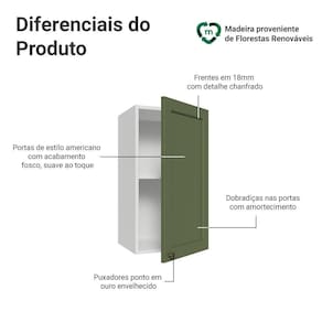 O acabamento de alta resistência da estrutura é em Branco e das portas em Verde. Possui uma textura suave ao toque, trazendo leveza e sofisticação ao ambiente. O destaque vai para os puxadores ponto em ouro envelhecido, feitos com metal resistente. Outro diferencial está no detalhe chanfrado das frentes, que forma molduras elegantes e dá profundidade ao design, refletindo o estilo americano com um toque moderno.