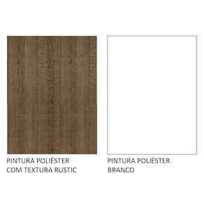 O acabamento da estrutura é em amadeirado Rustic e o da porta é branco. É feito em Pintura Poliéster com 7 camadas que protegem o móvel dos efeitos do álcool da água e do calor.