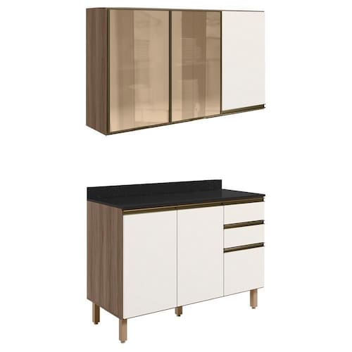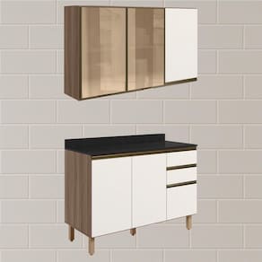 Conjunto de Armário Aéreo 3 Portas e Balcão com Tampo para cozinha, funcional e moderno, ideal para composições que otimizam o espaço com elegância. Fabricado em MDF, com estrutura e tampo de 15mm, forro de fundo de 3mm e acabamento em pintura UV (fosco ou brilho). O Conjunto é composto por 1 armário aéreo com 2 portas de vidro reflecta e 1 em MDF com dobradiças de 35mm com amortecedor, que garantem fechamento suave e silencioso, além de puxadores em perfil de alumínio e 2 prateleiras internas. O Balcão com tampo 15mm que conta com 3 gavetas com corrediças telescópicas, 1 prateleira interna e 2 portas com dobradiças de 35mm com amortecedores. Os 5 pés possuem altura de 15,5cm com regulagem adicional de 1,5cm, garantindo estabilidade em qualquer piso. Estes móveis chegarão em sua casa separados em 05 volumes.