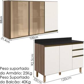 Peso Suportado do Balcão: 40Kg (20Kg tampo, 12Kg gavetas e 8Kg prateleira)