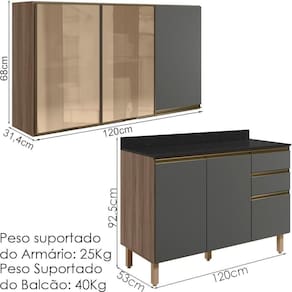 Peso Suportado do Balcão: 40Kg (20Kg tampo, 12Kg gavetas e 8Kg prateleira)