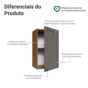 O acabamento de alta resistência da estrutura é em tom amadeirado Rustic e das portas em Cinza. Possui uma textura suave ao toque, trazendo leveza e sofisticação ao ambiente. O destaque vai para os puxadores ponto em ouro envelhecido, feitos com metal resistente. Outro diferencial está no detalhe chanfrado das frentes, que forma molduras elegantes e dá profundidade ao design, refletindo o estilo americano com um toque moderno.