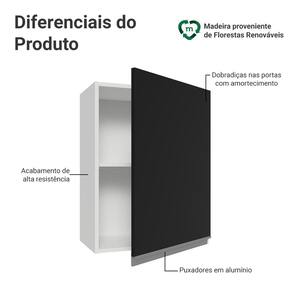Produzido com materiais de alta qualidade, o armário oferece excelente aproveitamento interno, com prateleira ideal para organizar louças, utensílios e mantimentos. As portas possuem sistema de amortecimento, garantindo um fechamento suave e silencioso. Os puxadores no estilo cava, em perfil de alumínio, completam o visual moderno e elegante do móvel.