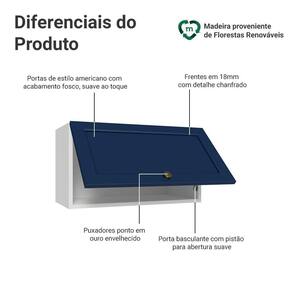 O acabamento de alta resistência da estrutura é em Branco e da porta em Azul. Possui uma textura suave ao toque, trazendo leveza e sofisticação ao ambiente. O destaque vai para os puxadores ponto em ouro envelhecido, feitos com metal resistente. Outro diferencial está no detalhe chanfrado das frentes, que forma molduras elegantes e dá profundidade ao design, refletindo o estilo americano com um toque moderno.