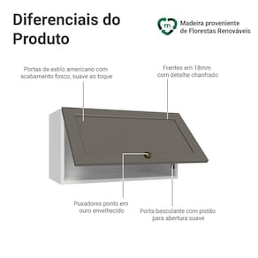 O acabamento de alta resistência da estrutura é em Branco e da porta em Cinza. Possui uma textura suave ao toque, trazendo leveza e sofisticação ao ambiente. O destaque vai para os puxadores ponto em ouro envelhecido, feitos com metal resistente. Outro diferencial está no detalhe chanfrado das frentes, que forma molduras elegantes e dá profundidade ao design, refletindo o estilo americano com um toque moderno.