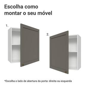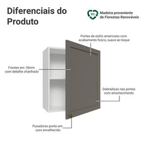 O acabamento de alta resistência da estrutura é em Branco e das portas em Cinza. Possui uma textura suave ao toque, trazendo leveza e sofisticação ao ambiente. O destaque vai para os puxadores ponto em ouro envelhecido, feitos com metal resistente. Outro diferencial está no detalhe chanfrado das frentes, que forma molduras elegantes e dá profundidade ao design, refletindo o estilo americano com um toque moderno.