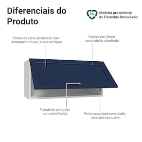O acabamento de alta resistência da estrutura é em Branco e da porta em Azul. Possui uma textura suave ao toque, trazendo leveza e sofisticação ao ambiente. O destaque vai para os puxadores ponto em ouro envelhecido, feitos com metal resistente. Outro diferencial está no detalhe chanfrado das frentes, que forma molduras elegantes e dá profundidade ao design, refletindo o estilo americano com um toque moderno.