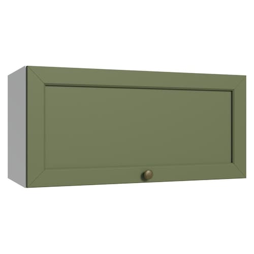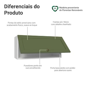 O acabamento de alta resistência da estrutura é em Branco e da porta em Verde. Possui uma textura suave ao toque, trazendo leveza e sofisticação ao ambiente. O destaque vai para os puxadores ponto em ouro envelhecido, feitos com metal resistente. Outro diferencial está no detalhe chanfrado das frentes, que forma molduras elegantes e dá profundidade ao design, refletindo o estilo americano com um toque moderno.