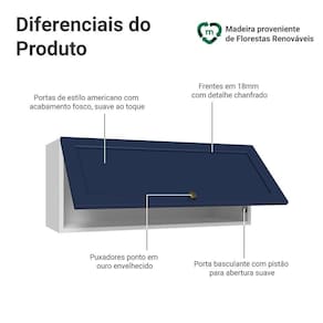 O acabamento de alta resistência da estrutura é em Branco e da porta em Azul. Possui uma textura suave ao toque, trazendo leveza e sofisticação ao ambiente. O destaque vai para os puxadores ponto em ouro envelhecido, feitos com metal resistente. Outro diferencial está no detalhe chanfrado das frentes, que forma molduras elegantes e dá profundidade ao design, refletindo o estilo americano com um toque moderno.