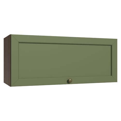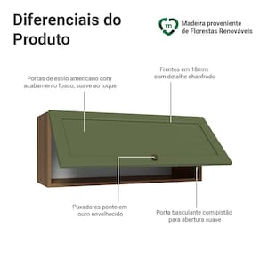 O acabamento de alta resistência da estrutura é tom amadeirado Rustic e da porta em Verde. Possui uma textura suave ao toque, trazendo leveza e sofisticação ao ambiente. O destaque vai para os puxadores ponto em ouro envelhecido, feitos com metal resistente. Outro diferencial está no detalhe chanfrado das frentes, que forma molduras elegantes e dá profundidade ao design, refletindo o estilo americano com um toque moderno.