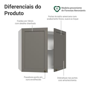 O acabamento de alta resistência da estrutura é em Branco e das frentes em Cinza . Possui uma textura suave ao toque, trazendo leveza e sofisticação ao ambiente. O destaque vai para os puxadores ponto em ouro envelhecido, feitos com metal resistente, que adicionam personalidade e um charme único. Outro diferencial está no detalhe chanfrado das frentes, que forma molduras elegantes e dá profundidade ao design, refletindo o estilo americano com um toque moderno.